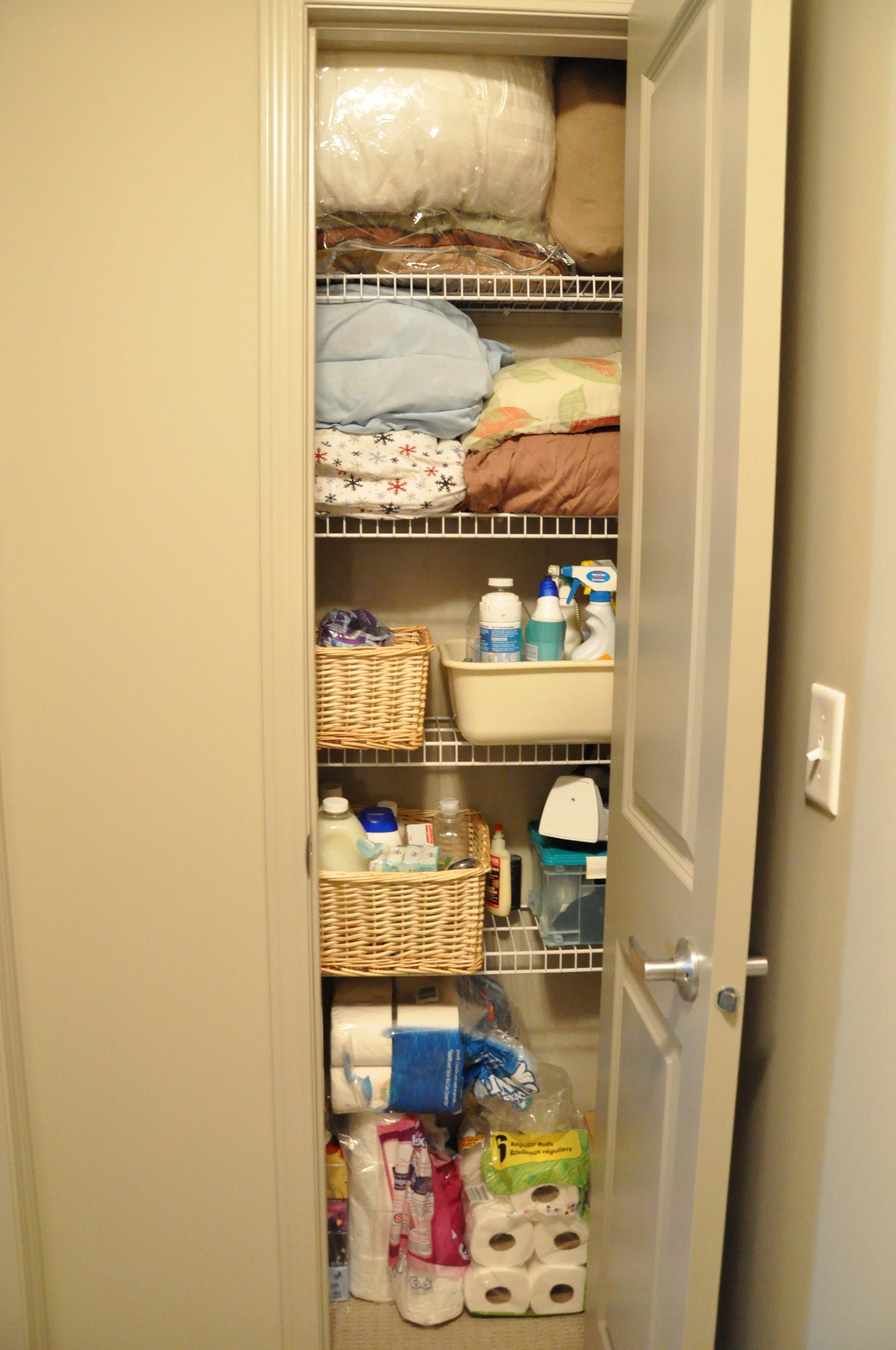 Next up were linen + storage closets and cupboards. That meant donating a few suitcases, DVDs, decoration items, electronics, small appliances, linens … a lot of linens and streamlining cleaning products.